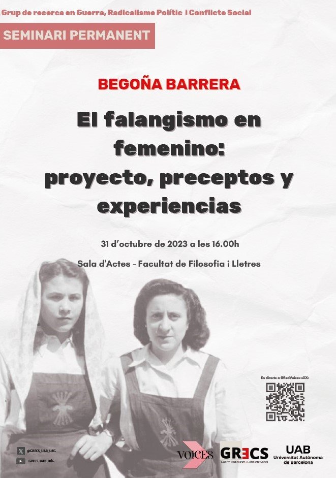 En colaboración con la red VOICES, el día 31 de octubre se desarrollará en la UAB el seminario de Begoña Barrera, de la Universidad de Sevilla y miembro de la Red, “El falangismo en femenino: proyecto, preceptos y experiencias”.