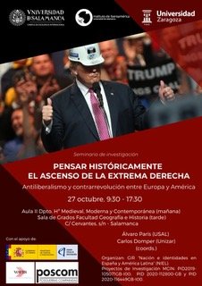 El próximo viernes, 27 de octubre, Carlos Domper Lasús (UNIZAR) y Álvaro París (USAL) organizan en la Facultad de Geografía e Historia de la Universidad de Salamanca el seminario "Pensar históricamente el ascenso de la extrema derecha: antiliberalismo y contrarrevolución entre Europa y América”. Este seminario pretende discutir sobre el resurgimiento de la extrema derecha en nuestras sociedades a partir de un enfoque histórico de larga duración, que tenga en cuenta la evolución de las alternativas antiliberales y contrarrevolucionarias integrando dos perspectivas: los análisis “desde arriba” y “desde abajo”. De este modo, el seminario se articula a través de...