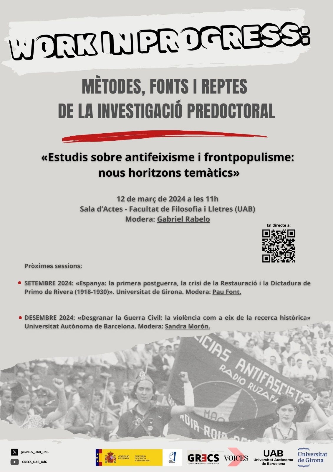 El Grupo de Investigación en Guerra, Radicalismo Político y Conflicto Social (GRECS), formado por investigadoras e investigadores de la UAB y de la Universitat de Girona integrados en VOICES, organizará a lo largo de este año una serie de seminarios "work in progress" donde las doctorandas y doctorandos del grupo tendrán la oportunidad de presentar el estado de sus investigaciones a la comunidad universitaria. La primera sesión, moderada por Gabriel Rabelo (UAB), "Estudios sobre antifascismo y frentepopulismo: nuevos horizontes temáticos", se celebrará el próximo día 12 de marzo a las 11 h, en el Salón de Actos de la...